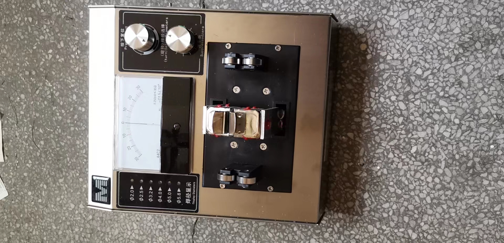 2.将仪器面板右上方的规格选择按至被测焊条相应规格指示位置,调节平衡电位器,使指针指向零位。