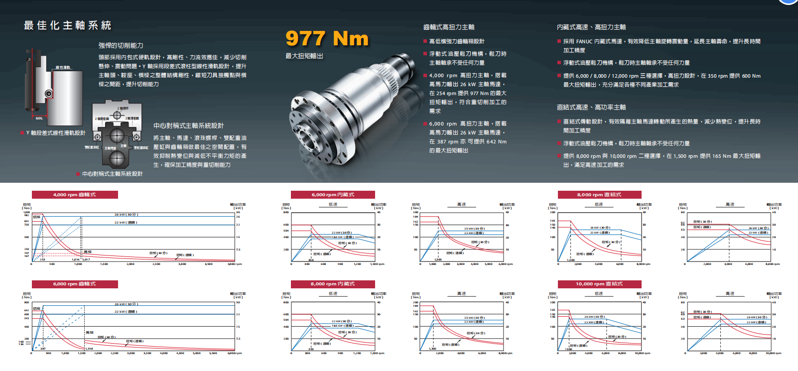 將主軸、馬達、滾珠螺桿、雙配重油壓缸與齒輪箱做之空間配置,有效抑制熱變位與減低不平衡力矩的產生,確保加工精度與重切削能力