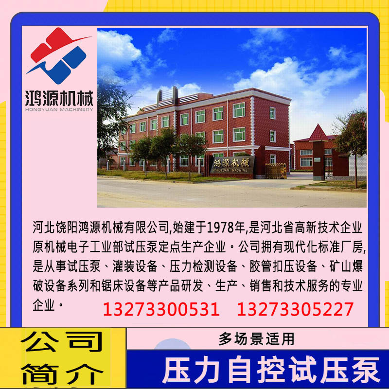 2D-SY型(6.3—80MPa)电动试压泵,主要使用于各类压力容器、氧气瓶、管道、阀门、蒸气锅炉等作水压试验,予应力加工新工艺和试验室中获得液体高压源的设备。