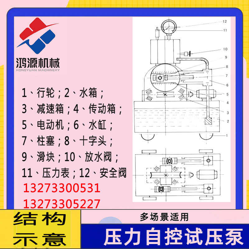 该产品为卧式2缸往复泵。由电动机、减速箱、传动箱、水缸、集水器、安全阀及水箱等主要部件组成。