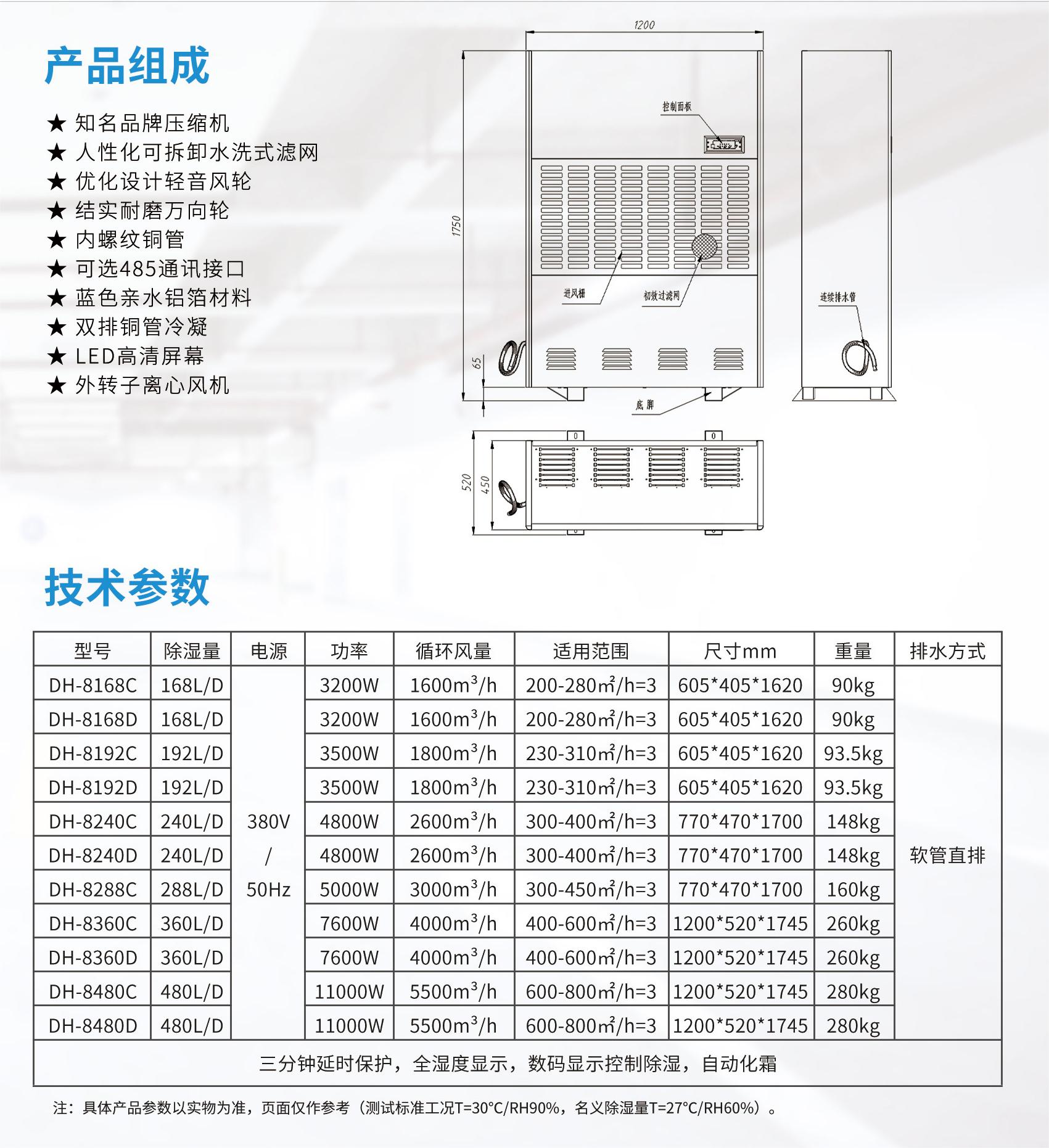 百科特奥168升除湿机,168升工业除湿机DH-8168D。在阴雨天气状况下,潮湿对于工厂企业的工业生产,以及商品的储存实在是一件烦恼的事情。梅雨时节,我们通常会遇到以下两个问题:一方面,湿度过高,使得许多原材料或商品尤其 是食品,木制品以及纸制品等受潮;另一方面,阴雨天气多,增加了生产车间湿度控制的难度,对车间的正常生产和产品的品质都会有一定的影响。