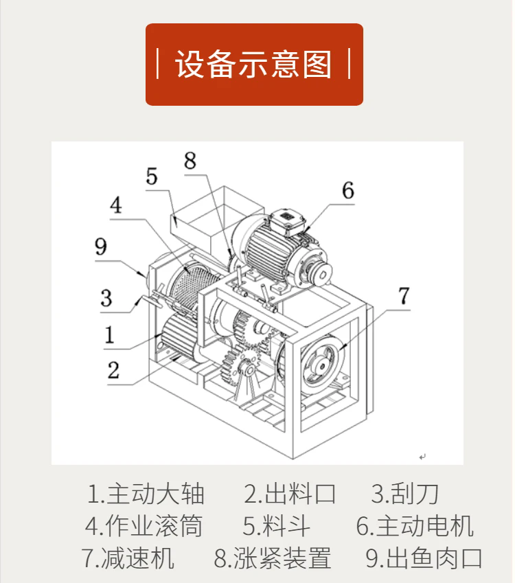 利用滚动的采肉筒和转动的橡胶带的相互压榨运动将鱼挤入鱼肉采肉机的采肉筒内,而把鱼皮鱼骨留在采肉筒外,由刮刀把它送出机外,以电动机为动力。