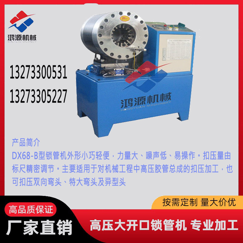 5、 操作:根据所扣压胶管的规格,按尾页参考表选择合适的模具安装到模座上,并按表中数据调整好标尺位置即可锁管。锁管结束后,用卡尺测量扣压后管套外径尺寸是否符合参考表数据,如不符,则精调标尺,直至符合要求为止。因管套的生产厂家不同,其具体尺寸、材质、硬度等不尽相同,这些因素都会对锁管结果造成不同程度的影响,因此,表中数据仅供参考,详细数据以压力试验为依据。