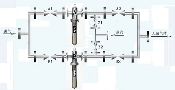 如有大真空泵超负荷运行可以同时使用AB二台过滤器①.打开A1A2B1B2阀门,(1)除菌过滤器一般采用十字悬挂式,水平进出。多芯过滤器可设计成落地式。(2)有些使用场合根据实际需要分成预过滤器、精过滤器两种。(3)空气流向:从外向内穿过滤芯,请根据壳体标签上箭头方向安装。(4)进入除菌过滤器的空气必须先经过储气罐稳压预过滤器,否则将影响除菌滤芯的寿命,达不到预期的除菌效果。(5)定期杀菌,根据实际使用情况每周1~2次。每次30分钟,采用经过洁净饱和蒸汽杀菌。蒸汽温度<121℃,蒸汽压力<0.3MPa。阀门须缓慢开关。灭菌过程须专人看管。(6)经过100次蒸汽杀菌后或滤芯压差达到0.07-1.0MPa时。