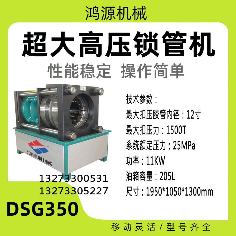 本机为DSG—350型内胀外压机,是生产复合管总成扣压所用的高压大口径复合管管头与外套、芯子压合在一起的专用设备。该设备是根据用户现场实际应用经验而开发的,在用户以往的胶管总成扣压经验当中,用户把胶管总成扣压完成之后试压完成,胶管总成不发生泄漏即合格,但是在实际当中,胶管总成扣压完之后,胶管外层的铁皮套筒与胶管外圆结合紧密,而且套筒内壁的防滑沟槽由于扣压后产生永久性形变而嵌入到胶管的外胶层里,但由于胶管有弹性,且弹性变形量大,所以胶管内芯的防滑沟槽与胶管内壁之间结合并不紧密,经长时间使用,尤其是管道内输送流体的压力高低往复变化时,更容易造成胶管与内芯松动,从而使管路发生泄漏,基于这种使用情况,特开发本设备,在扣压完胶管外套筒之后,再通过胶管内芯胀模使内芯胀到所需尺寸,从而使胶管内芯与胶管内壁紧密结合,有效防止胶管总成发生泄漏