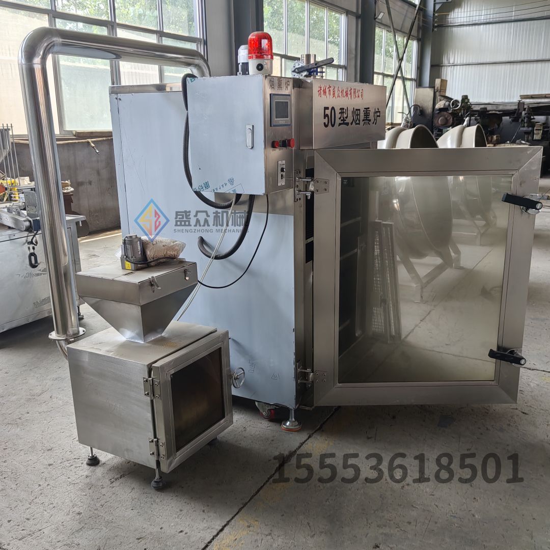 烟熏炉用于牛肉干、鸡鸭产品腊肉、腊肠、哈尔滨红肠、台烤、豆干、枣肠、猪头肉、猪蹄、鸡蛋、鹌鹑蛋、三文鱼、鱼类等产品的烟熏、上色加工,全自动操作设备,主要用肉类食品、鱼制品的烟熏工艺。