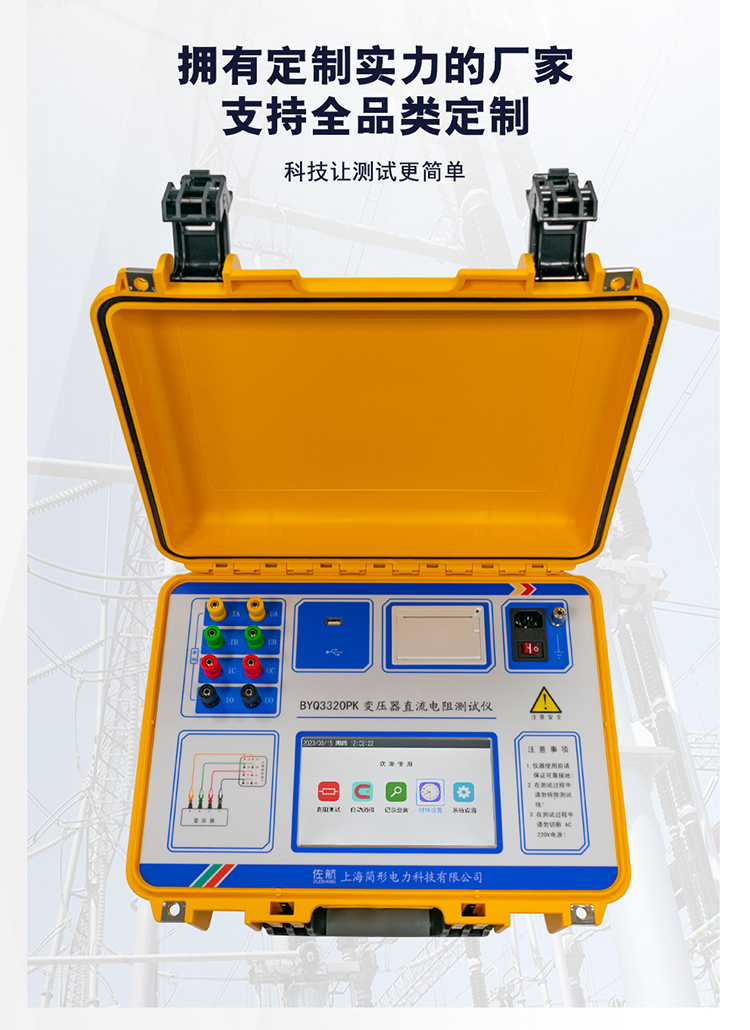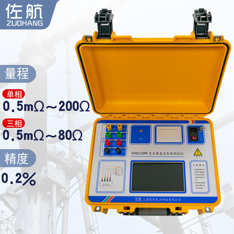 佐航BYQ3320PK变压器直流电阻测试仪是集三相测试(Yn,Y、△)和消磁功能于一体的新一代快速测试仪,是测量大型电力变压器直流电阻的理想设备。屏幕采用真彩色高分辨率工业显示屏,全触控操作,具有中文菜单提示功能,操作简便直观,测试速度快,准确度高,量程宽。