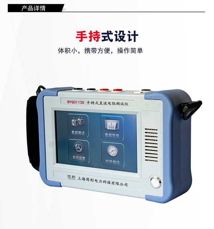 佐航BYQ3113S手持式直流电阻测试仪。采用全新电源技术,具有体积小、重量轻、输出电流大、重复性好、抗干扰能力强、保护功能完善等特点。整机由高速单片机控制,自动化程度高,具有自动放电和放电报警功能。仪器测试精度高,操作简便,可实现变压器直阻的快速测量。