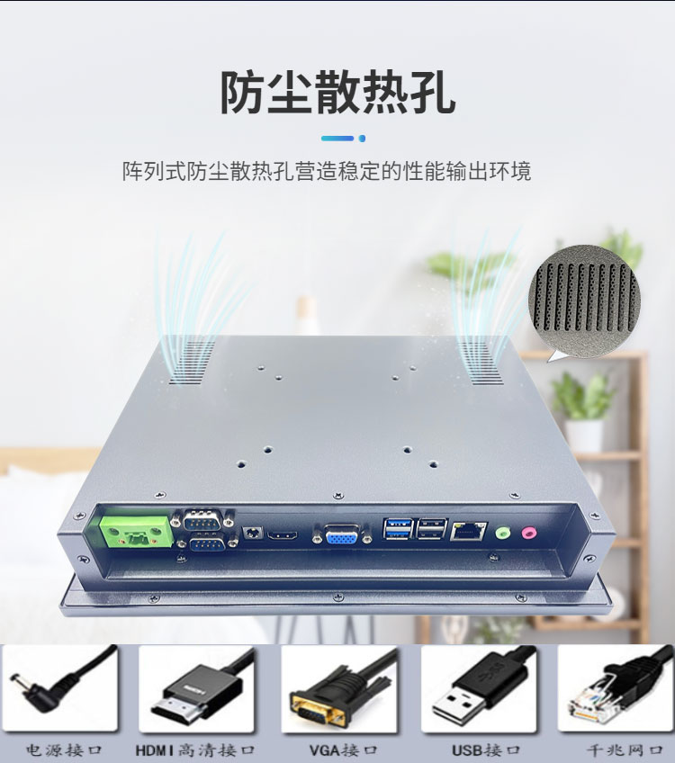 整机配置10.4寸宽温、高亮度LED液晶显示屏,集成工业级低功耗嵌入式主板,支持SSD、HDD,具有多个I/O接口,电阻式触摸屏可选; 10.4寸LED显示屏,并具有待机节能模式。