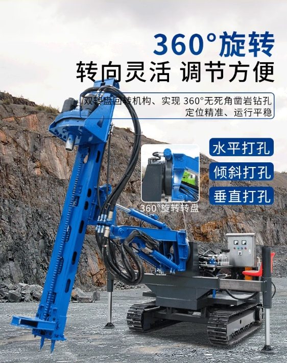 ’360?旋转转向灵活 调节方便,双转盛回转机构、实现 360?无死角凿岩钻孔定位精准、运行平稳