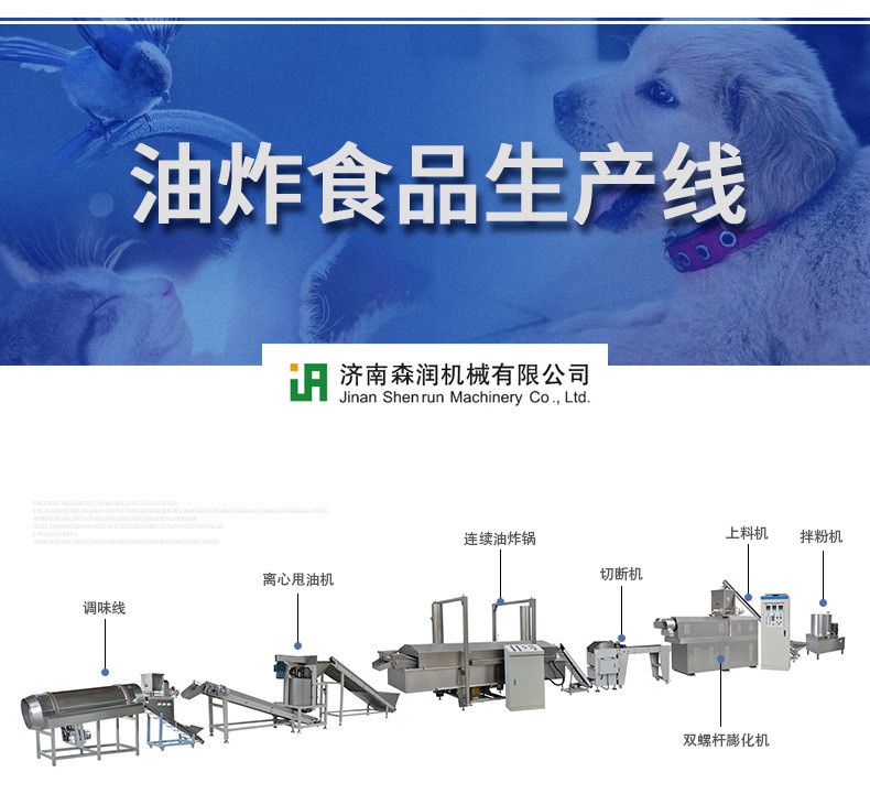 【1】拌粉机→【2】螺旋提升机→【3】双螺杆主机→【4】牵引切断机→【5】自动油炸机→【6】调味线