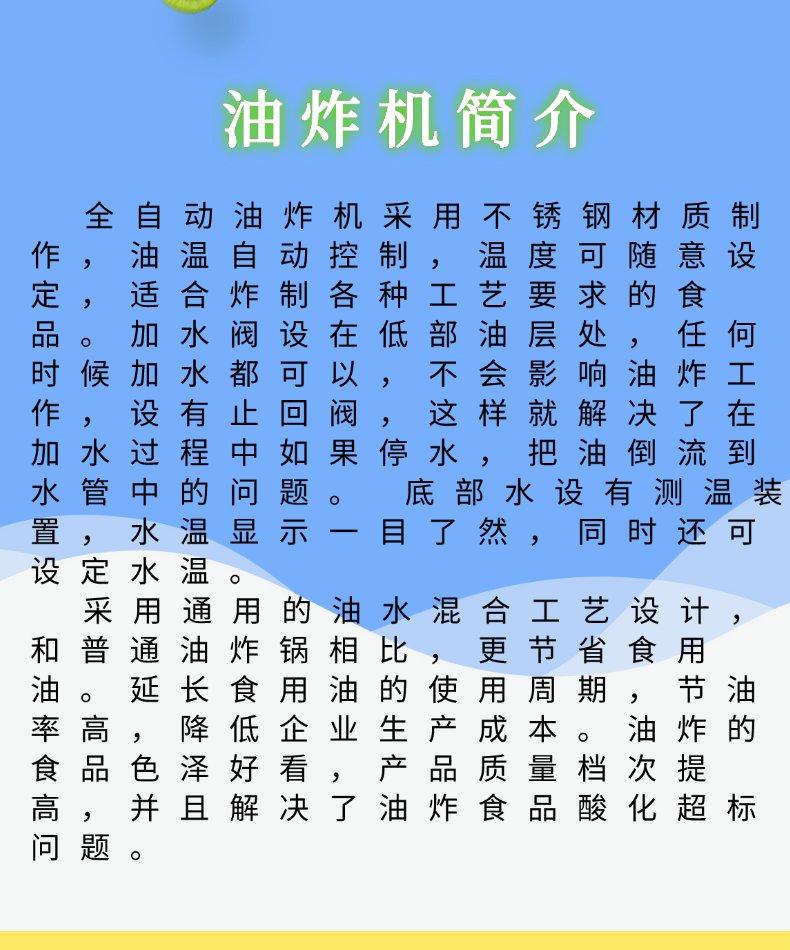 智能控制:配备智能化温控系统,能够精确控制油炸温度与时间,减少因操作不当导致的食品质量下降。