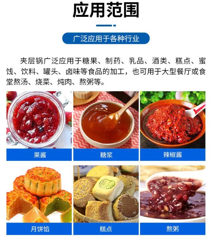 夹层锅通常由锅体和支脚组成。锅体是由内外球形锅体组成的双层结构形式,中间夹层通入蒸汽加热或导热油。有固定式、可倾式、搅拌式等样式。(食品加工机械厂家Tel:156*0636-3332)