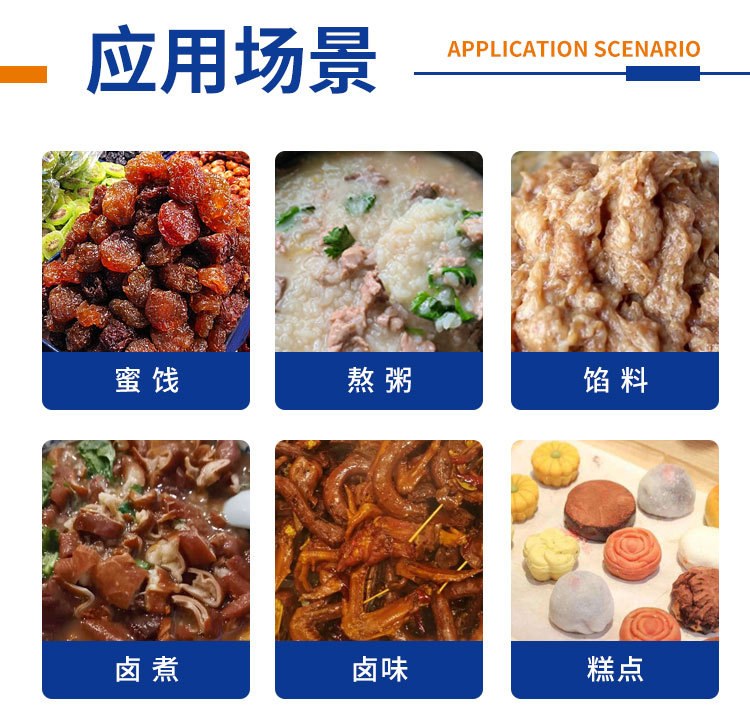 适应于各种高粘度酱料的搅拌加热蒸煮炒制:焙烤馅料炒制业(果酱、莲蓉、豆沙、水果蓉、蜜饯、枣泥)、肉制品熟食加工业(卤味、肉酱、牛肉酱、海鲜酱)、调味品业(火锅底料、方便面酱料、香其酱)、糖果业(果酱、糖料)、蔬菜玉米加工业(香菇酱、辣椒酱)、酒店用品及快餐(食堂熬汤、烧菜、炖肉、熬粥)等食品加工业。