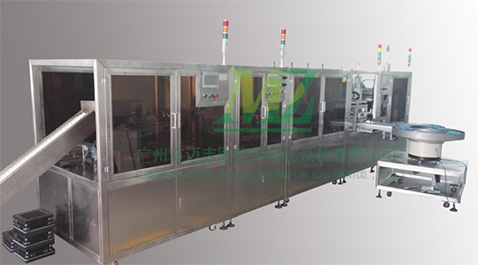 4、该机采用韩国世宗双阀和多功能软件控制系统实现加药喷雾,两套100头插入式热风烘干器,一次能同时加取100个复合帽的输帽装置,一台全自动真空补偿式真空压盖机,以及能同时抓取100支成品管的取管装泡沫托机构,取管后将其插入泡沫包装托盘机构,将这些机构动作采用可编程程序控制和气动机构执行,即可全自动完成真空采血管BCA促凝剂加药、烘干、加帽、抽真空压盖、取管、装托盘的全部工序。该机具有自动化程度高、生产效率高、性能稳定、故障率低、操作简便、维护费用低等特点。