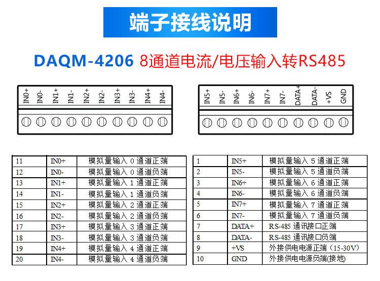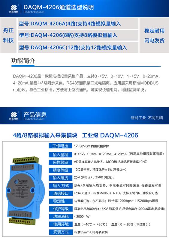 DAQM-4206 是一款标准模拟量采集产品,支持 0~ 5V、1~ 5V、0~20mA、4~20mA 等量程 8 通道单端或差分输入。RS485 通讯接口光电隔离,应用层采用标准 MODBUS-RTU 协议,符合工业标准。方便与上位机通讯,可实现快速组网,构建监测系统。
