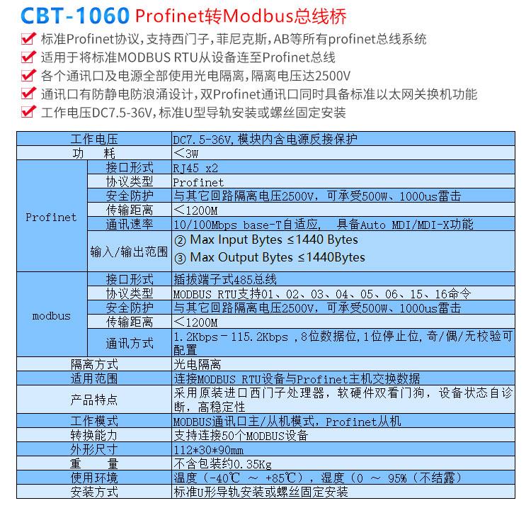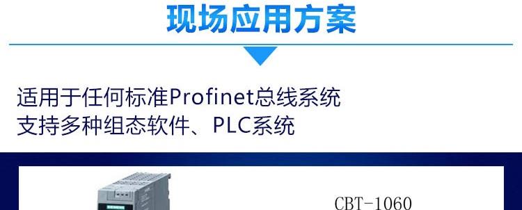 CBT-1060 采用标准 Profinet 协议,支持多种组态软件、PLC 系统。用于将标准MODBUS RTU 从设备连至 Profinet 总线,产品工作电压 DC7.5-36V,标准导轨安装,各个通讯口及电源全部使用光电隔离,隔离电压达 2500V,同时通讯口有防静电防浪涌设计,双 Profinet 通讯口同时具备标准以太网关换机功能。
