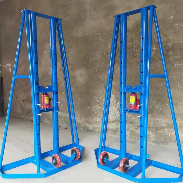 电缆放线架 主要规格分;适应电缆盘直径1m 1.2m 1.5m 2m 2.4m 2.8m 3m 3.2m 3.4m 4m等特殊规格可以定做。电缆放线架外观形式分;卧式电缆放线架 立式电缆放线架 大型电缆放线架 重型电缆放线架 梯形电缆放线螺旋电缆放线架 普通液压电缆放线架吊式电缆放线架液压螺旋两用电缆放线架等螺旋电缆放线架又称为“手摇放线架”,用于线路工程中延放导线时搁置正盘导线 ,采用丝杠升降线盘,轻巧,适合人力放线使用,规格为3吨和5吨。手摇放线架操作说明:1、将手摇放线架铁杠穿过线盘中心孔,把放线盘分别放在线盘两侧;2、利用上部的齿轮调节丝杆高度使用瓦架贴到横杠;3、继续转动丝杠使线盘离地布放电缆。注意事项:1:手摇放线架必须紧贴线盘防止横杠弯断;2:螺旋放线架在平稳地面使用否则容易倾倒;3:使用加力棒转动丝杆,必须180?的正反使用;4:注意利用紧贴齿轮的齿牙。液压放线架是电信,通信等施工工程中通用的一种液压电缆放线架,用于延放导线时搁置正盘导线,起升高度可灵活调整。液压电缆放线架(以下简称“液压放线架)采用液压系统,适合人力放线使用。液压放线架由两个三角形状支架与一根坚固的钻杆组合成一套,操作简单,使用方便。