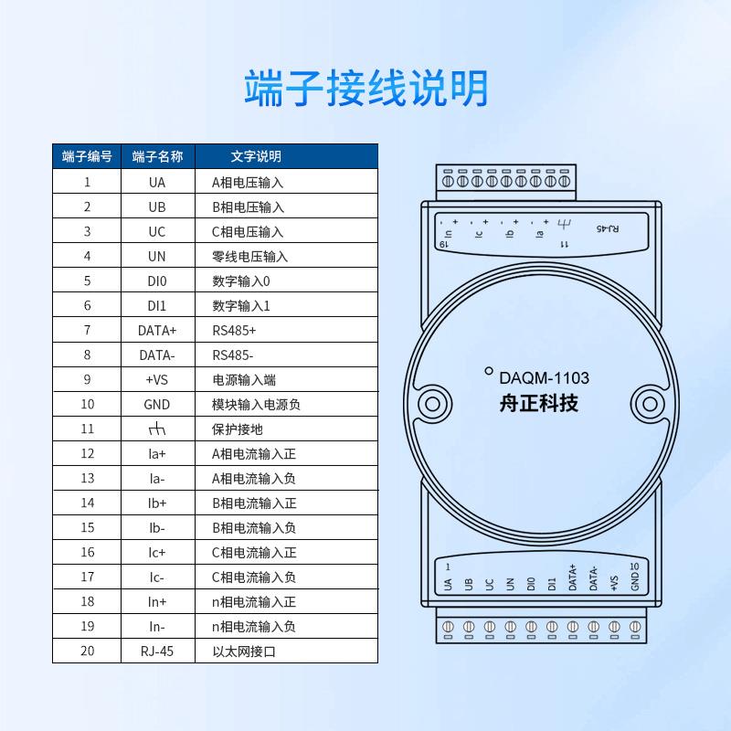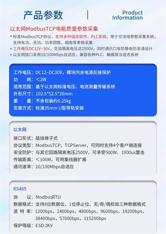 DAQM-1103 采用标准 ModbusTCP 协议,支持多种组态软件、PLC 系统。用于交流电参数采集系统,支持有功、无功、功率因数、相角等参数采集。产品工作电压 DC12-30V,标准 35mm 导轨安装,交流隔离电压达 2500V,同时通讯口有防静电防浪涌设计,10/100Mbps 自适应以太网和 RS485双接口设计,支持 MODBUS 协议兼容各种 PLC、触摸屏及组态系统。