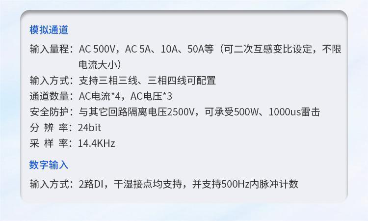 输入量程AC 500V,AC 5A、50A、10A(支持二次互感变比设定)