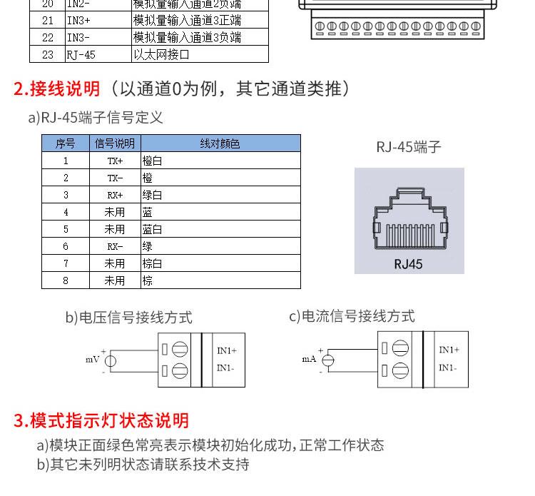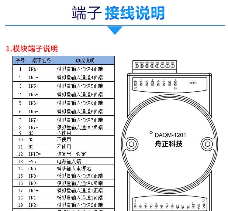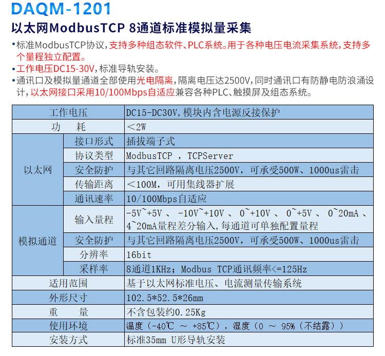 DAQM-1201 采用标准 ModbusTCP 协议,支持多种组态软件、PLC 系统。用于各种电压电流采集系统,支持多个量程独立配置。产品工作电压 DC9-30V,标准导轨安装,通讯口及模拟量通道全部使用光电隔离,隔离电压达 2500V,同时通讯口有防静电防浪涌设计,以太网接口采用10/100Mbps 自适应兼容各种 PLC、触摸屏及组态系统。