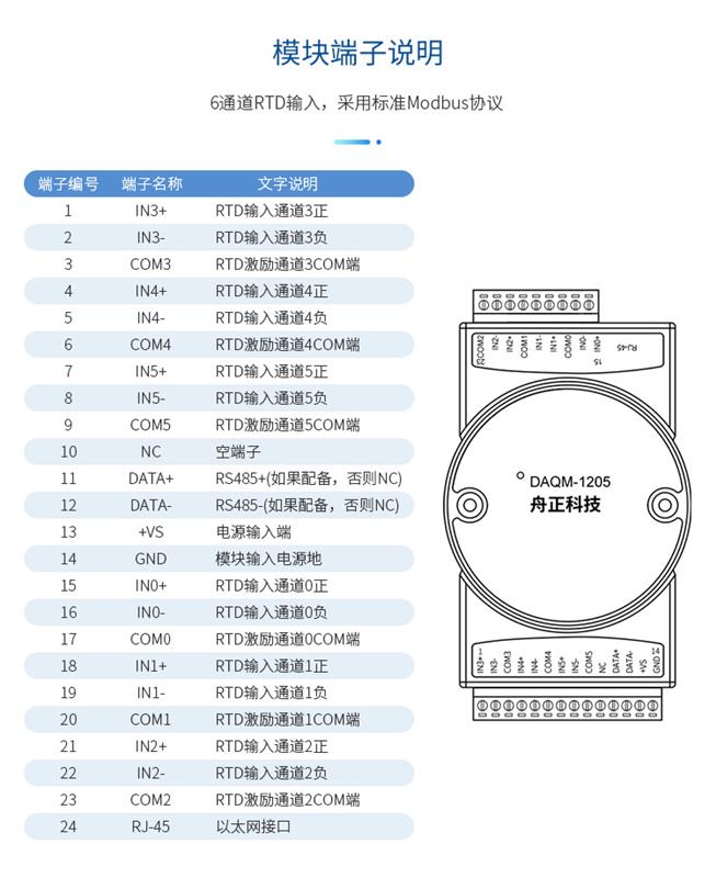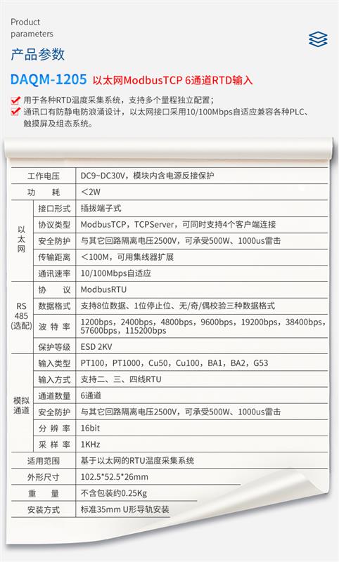 DAQM-1205 采用标准 ModbusTCP 协议,支持多种组态软件、PLC 系统。用于各种 RTD 温度采集系统,支持多个量程独立配置。产品工作电压 DC9-30V,标准导轨安装,通讯口及模拟量通道全部使用光电隔离,隔离电压达 2500V,同时通讯口有防静电防浪涌设计,以太网接口采用10/100Mbps 自适应兼容各种 PLC、触摸屏及组态系统。