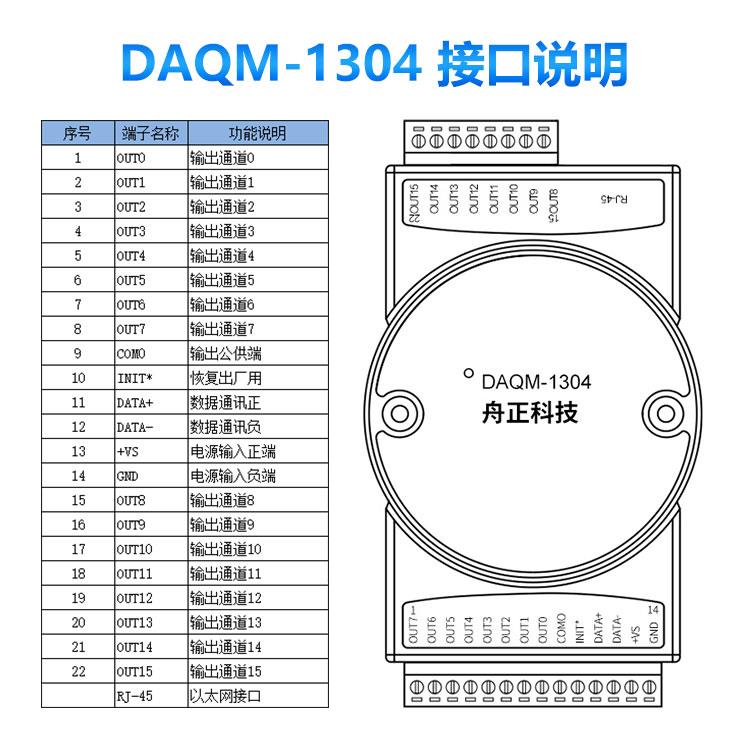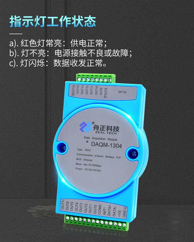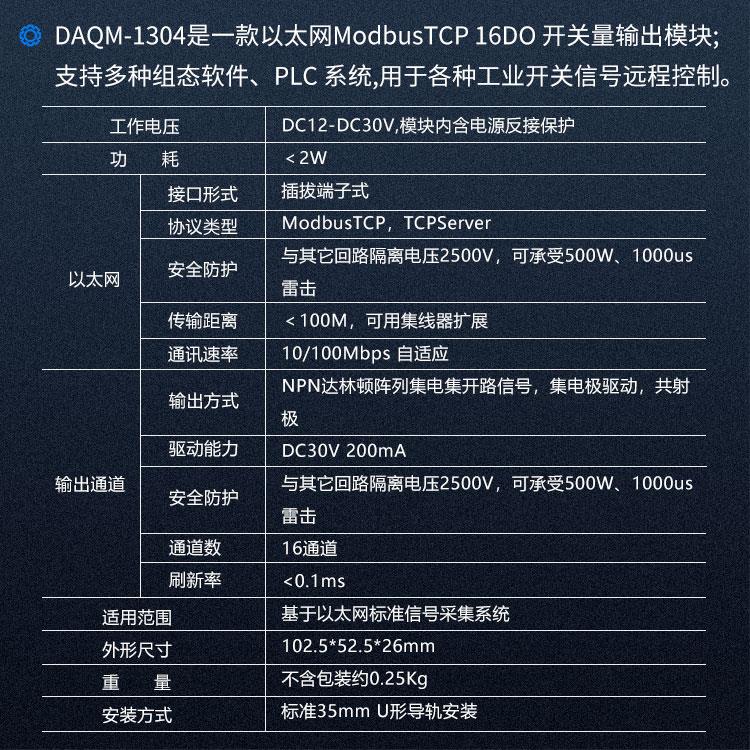 DAQM-1304 采用标准 ModbusTCP 协议,支持多种组态软件、PLC 系统。用于各种工业开关信号远程控制。产品工作电压 DC9-30V,标准 35mm U 型导轨安装,通讯口及输入通道全部使用光电隔离,隔离电压达 2500V,同时通讯口有防静电防浪涌设计,以太网接口采用 10/100Mbps 自适应兼容各种 PLC、触摸屏及组态系统。