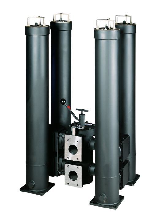 双筒过滤器适用于公称压力为0.6MPa的稀油润滑系统中,具有清除润滑油中杂质使供给润滑点的油达到洁净的功能,小型的为整体式,较大的为组合式,分别由二组过滤筒和一个三位六通换向阀组成,工作时一筒工作,一筒备用,可实现不停车切换过滤筒,达到循环润滑系统不间断工作的目的。