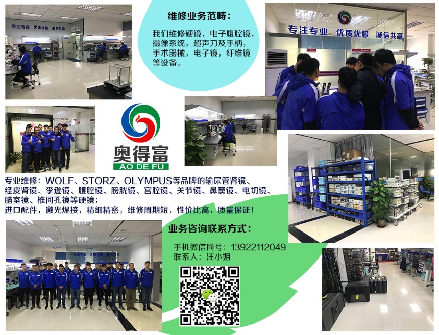 广州奥得富医疗设备维修有限公司是一家专业的第三方医用内窥镜维修服务商。主要提供电子镜、纤维镜、电子腹腔镜、硬镜、摄像系统,超声刀及手柄,手术器械等设备的维修服务。服务于广大医院、第三方维修公司和个人,拥有独立的维修中心、办公区和专业的维修工程师团队。秉承“专注专业、优质优服、诚信共赢!”的经营理念努力向前!稳步发展!
