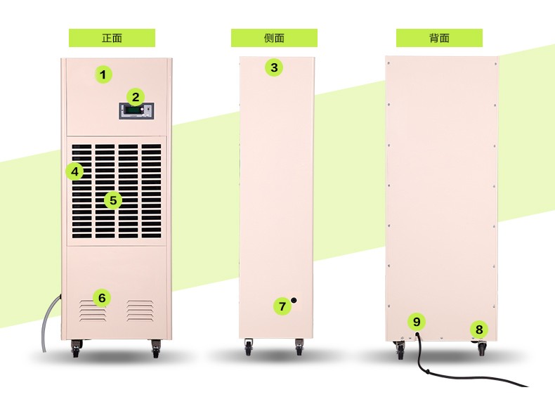 本产品属冷冻式除湿机,整机由压缩机、热交换器、风扇、机壳及控制器组成,其工作原理是:由风扇将潮湿空气抽入机内,经过制冷系统(压缩机,蒸发器,冷疑器)相互作用下疑结成霜,系统自动升温化霜成水流入盛水箱, 产生出干燥空气排出, 如此循环使室内湿度降低,潮湿空间逐步达到干爽的效果。