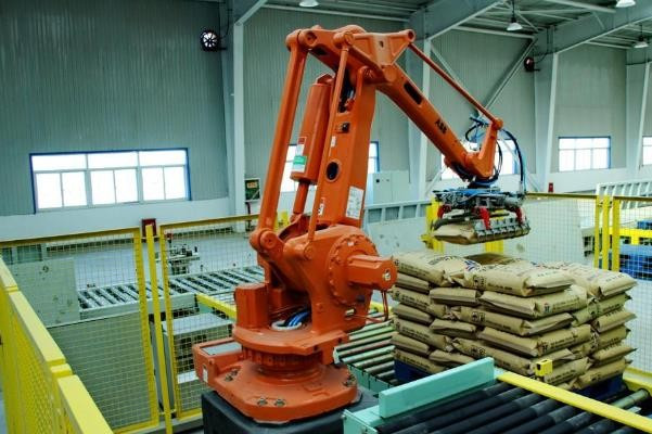 2.机器人码垛托盘输送线与机器人码垛机组合,并配以个种砖用抓手,可以在托盘上自动码放袋类、箱类、桶类、板类等包装物。