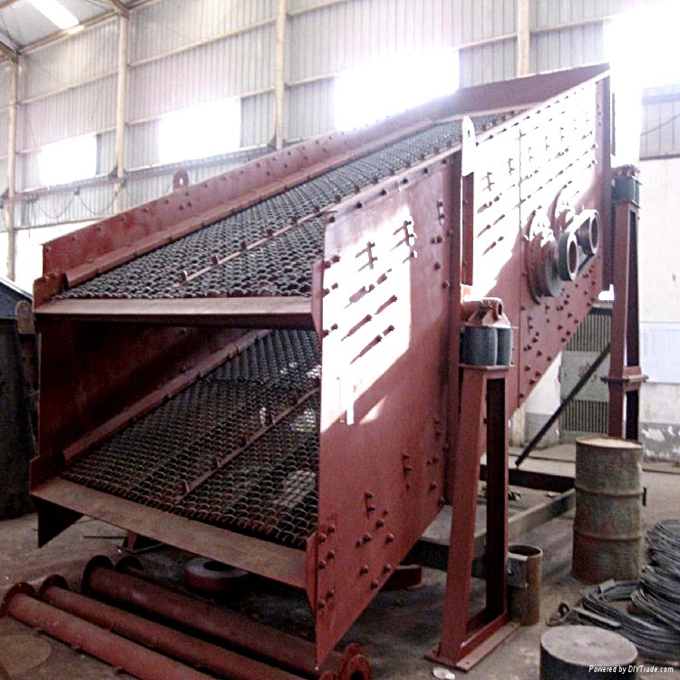 XZD型香蕉型振动筛是在等厚直线振动筛上注入香蕉形多段筛面的专有技术设计而成的。在入料端有一较大的斜坡筛面,随后紧接着以一定的角度逐级下降,直到出粒口为止,入料端的斜坡筛面可使更多的物料通过筛面时有较高的筛分速度和较薄的物料分层。因为大块物料较快地穿过陡坡,这种较早地分层使细的颗粒更快的靠近筛面,能相对不受阻碍地通过缝隙,所以,香蕉形振动筛具有极高的筛分效率和高于传统分级筛1.5-2倍处理量的特点。