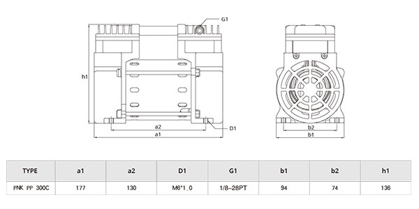 型号:PNK PP 300C;额定抽速:1.5 m3/h;极限真空:4000 mbar;额定功率:0.2 Kw;噪音等级:50 dB(A);重量:3.5 Kg;外形尺寸:L170*W124*H134mm