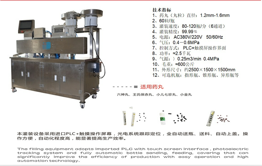 1、本机采用新技术,能对微丸(滴丸)剂进行自动计量并准确灌入特殊的异型瓶内,具有自动理瓶、理盖,自动检测、变频调速等功能,根据需要还可选装铝箔封口、喷码、贴标等功能。