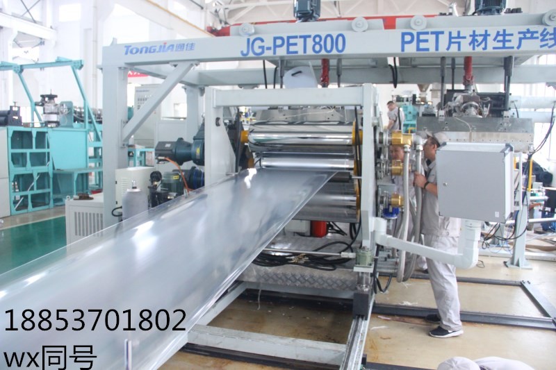 Pet是一种更环保的包装材料,生活中矿泉水瓶的材质就是pet材料的,现在的透明包装要美观,透明更要求环保,不能变成白色污染,所以通佳研发了降解材质的pet片材生产设备,而且不仅仅能生产pet片材,而且还能生产pla、pp等环保材料片材。