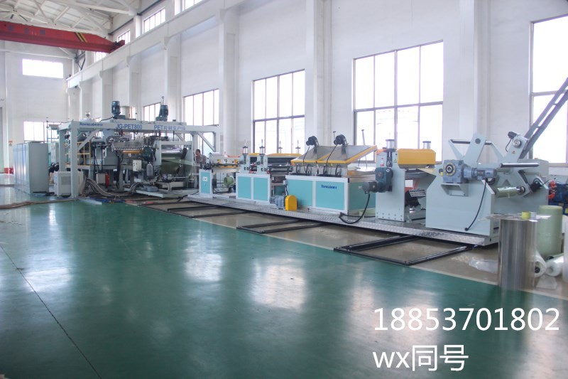 PET透明板生产线是为PET/PP/PLA设计的,在同一条线上也能生产出 PET,PP,PLA板材。它是一台多用途机器。 PET/PLA挤出片材生产线是我公司吸收国际先进技术,融合多项生产工艺配方体系,巩固研发出的一种免结晶干燥新型挤出片材生产线,。采用精密三辊压延工艺技术,特有专利技术双螺杆组合挤出机,最大限度减少了原料的粘度,提高了冷却效率,大大提升片材的品质和产量。