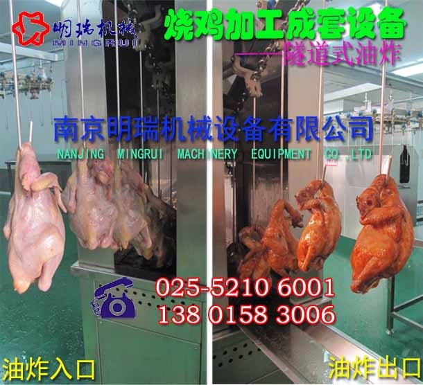 烧鸡香味浓郁、咸淡适口、酥香软烂,熟烂离骨、肥而不腻,是深受大众喜爱的传统风味菜肴。我国烧鸡加工工艺大同小异,但各地的烧鸡都有自己独特的加工工艺从而富有地方风味。南京明瑞机械设备有限公司机械化烧鸡加工设备是现代烧鸡生产机械设备和传统烧鸡加工工艺的完美结合,主要设备有:
