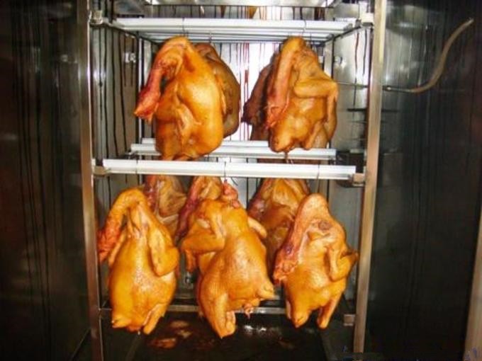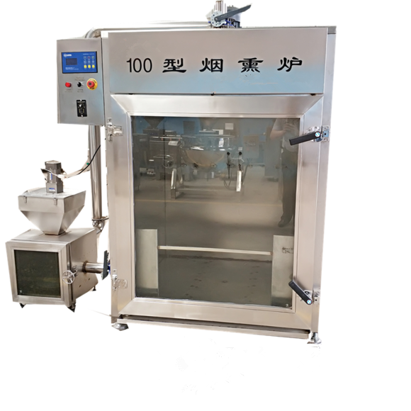 2、本机具有蒸汽加热(蒸煮)、烘烤干燥(热风)、烟熏、排气及清洗等功能。关键部件是由蒸汽管道、热交换器和出气管道组成完善的循环系统,箱内熏烟与热气的混合气体在两组循环风机的作用下,形成涡流区域,使混合气体以适宜的速度平稳而均匀地通过悬挂在烟熏箱内的肉制品,使其熟化和灭菌。