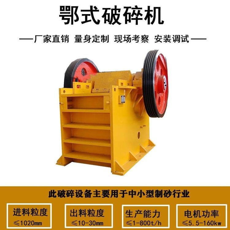 颚式破碎机在矿山、建材、基建等部门主要用作粗碎机和中碎机。按照进料口宽度大小来分为大、中、小型三种,进料口宽度大于600MM的为大型机器,进料口宽度在300-600MM的为中型机,进料口宽度小于300MM的为小型机。颚式破碎机结构简单,制造容易,工作可靠,使用维修方便。