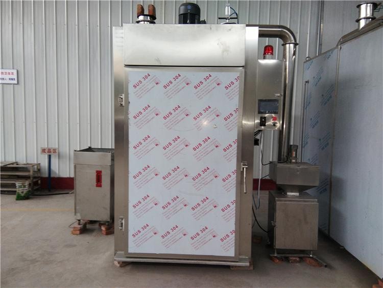 发烟系统:外置式木屑发烟箱体,发烟装置 上部为锯沫箱,由减速机带动搅拌机构,锯沫周期地送与下部发烟炉盘的电热器,由电控箱上的点火按钮控制,锯沫受热缓慢燃烧而发烟,被风机吸入主机以熏制熟食品。不仅使产品产生果木香气,而且可以使产品熏成由浅到深的金色,最深可以成为枣红色。