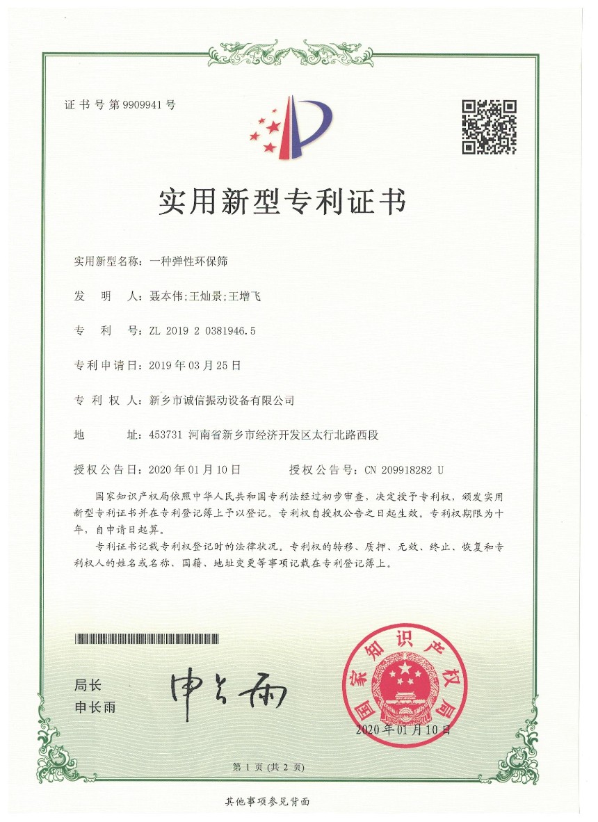 湿粘物料的筛分是当今国内外筛分技术研究的难点,因为湿粘物料互相粘结成团,导致松散困难或粘附在筛面上堵塞筛孔,使筛面的有效筛分面积降低,筛分效率下降。且料群不松散、不分层、整体运动,使筛分过程难以完成。所以湿粘物料的筛分是筛分作业中急需解决的重大难题,诚信振动公司的技术人员针对上述问题经过多年的现场考察和总结。终于研发出了TXHBS系列弹性环保筛,并取得了实用新型专利证书。