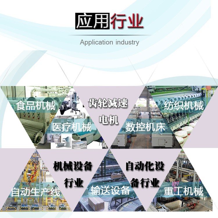 包装机械、应刷机械、食品机械、化工、纺织机械、染整设备、工业水泵、除尘设备等