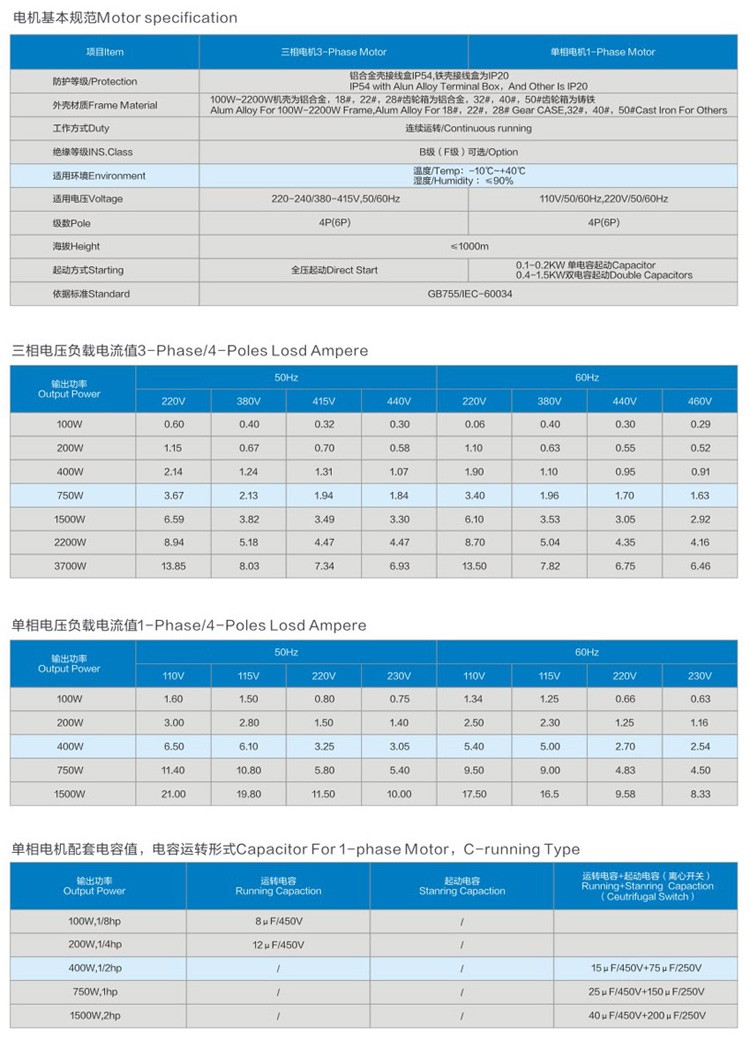 外壳材质:100W~2200W机壳为铝合金,18、22、28齿轮箱为铝合金材质;32、40、50齿轮箱为铸铁材质;