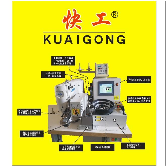 快工科技专业生产自动送扣机、自动钉立扣机(蘑菇扣)。技术先进,质量可靠,操作简单,性能稳定,多项国家专利。 振动盘子保用10年,人为损坏也免费换。机身大体零件保3年,电磁阀气缸振动器及其它配件保1年。现在新款快工8代国内超前先进,送扣电机永不丢步技术实现。无扣自动检测送扣可选配。扣子正反面识别功能。