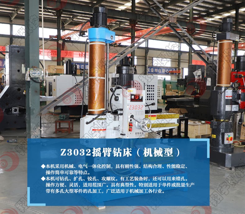 Z3032摇臂钻床钻孔直径(0-32)mm,是一种孔加工设备,适用行业/加工:金属加工/钻孔,扩孔,镗孔,铰孔,攻丝及修刮端面等多种形式的加工。按机床夹紧结构分类,摇臂钻可以分为液压摇臂钻床和机械摇臂钻床在各类钻床中,摇臂钻床操作方便、灵活,适用范围广,具有典型性,特别适用于单件或批量生产带有多孔大型零件的孔加工,是一般机械加工车间常见的机床。