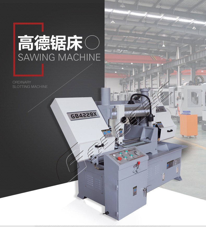 机床采用双立柱结构;配有大功率蜗轮传动机构,保持润滑,保证锯带运转的稳定,可延长锯带的使用寿命;锯床具有可调式锯带导向装置,保证锯带运转平滑,大大提高了锯带的切削质量和使用寿命;锯架可手动旋转0-45度,实现材料的角度锯切;采用切削行程开关控制,可随时根据工件的大小调整切削行程,大大提高了工作效率。
