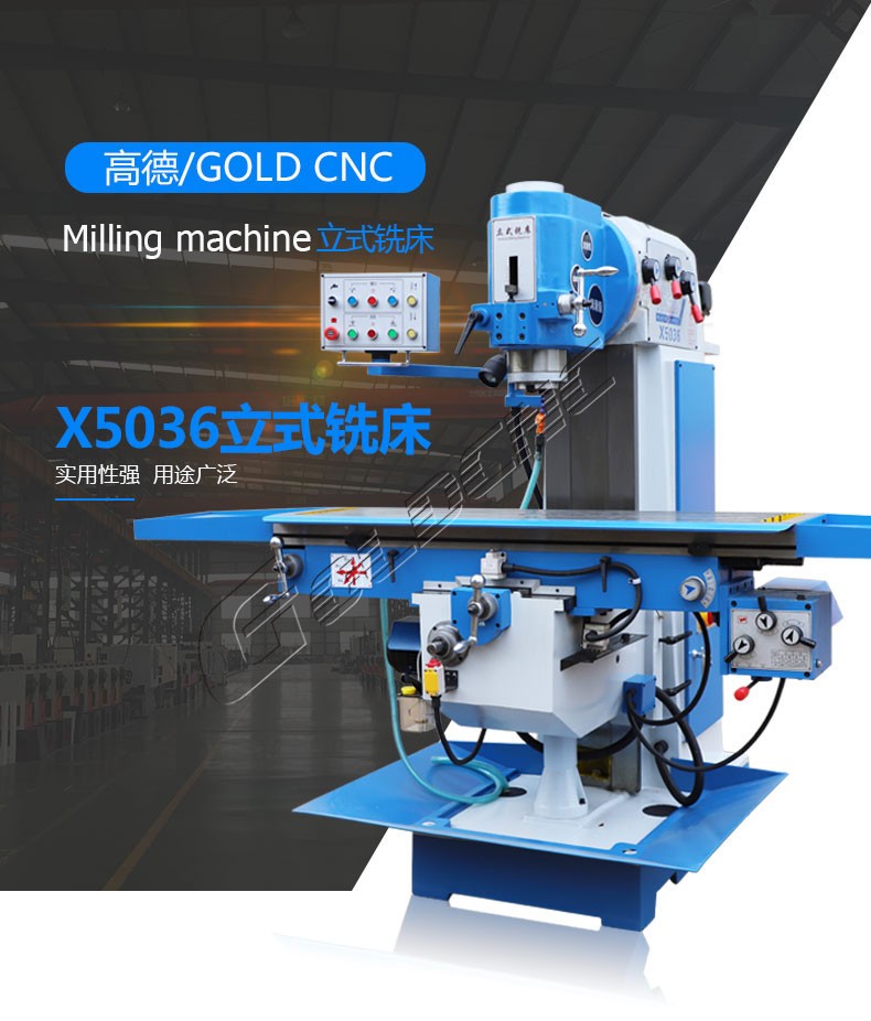 X5036立式铣床是一种通用金属切削机床。本铣床的主轴锥孔可直接或通过附件安装圆柱铣刀、成型铣刀、端面铣刀、角度铣刀等刀具,适用于加工部件的平面、斜面、沟槽、孔等,是机械制造、模具、仪器、仪表、汽车、摩托车等行业的理想加工设备。