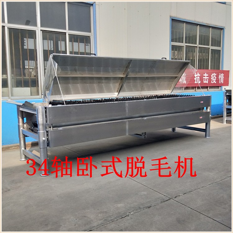 鸡鸭鹅用大型脱毛机,设备操作简单,将浸烫好的鸡鸭鹅从入口进入,从出口出来的就是脱好的鸡鸭鹅的白条,脱毛的时间是固定的,不需要人工控制,整个脱毛的时间为20秒左右,一个小时的脱毛量在1000-2500只左右。脱毛辊的间距是可以调节的,以便适应不同大小的家禽,进行更好的脱毛。