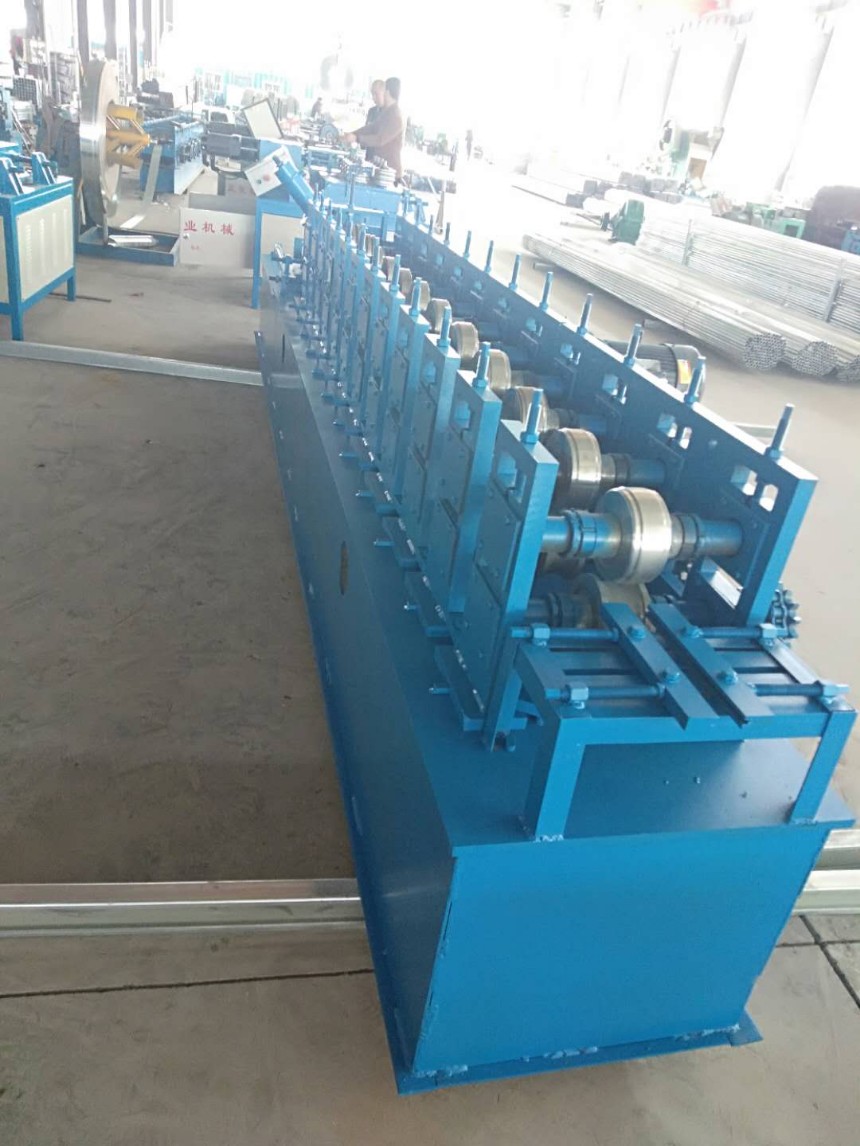 大棚卡槽设备详细参数;设备尺寸:长5m 宽0.5m 高1m电机功率:5.5kw .工作电压:380V生产速度:40米/分压型轴径:132道压轮轴径:40mm实心轴材质:45#钢调质压型轮:45#钢锻件,精车,磨光,表面硬镀铬设备底架大架:250H型钢,立板12mm传动方式:链条转动剪断机功率:3kw剪切刀:采用Cr12材质,经高温淬火而成,由二片刀组成成型系统:3Kw泵站,剪切设备压板厚度:0.5mm随机附件彩钢上料架一套成型部分分为精工式车轮旋转成型,成型效果好,减少轮子和愿材料之间的摩擦力,调试方便,快捷。
