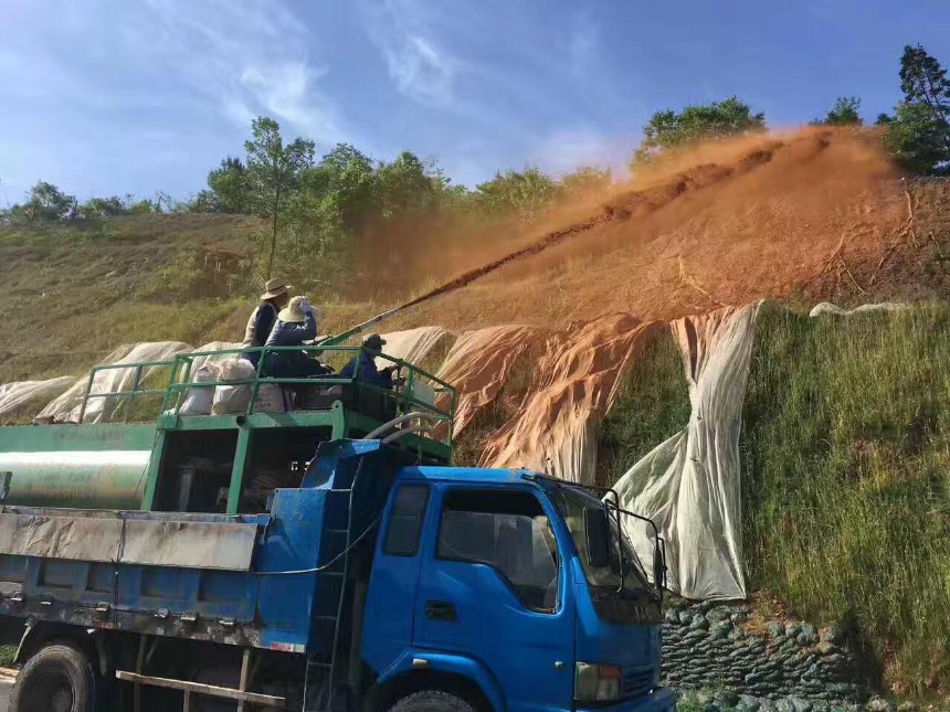 6、恒睿客土喷播机核心泵采用特制加压多级泵,可以将粘稠物料从喷嘴处高速喷出,直接射程20-50m,减少施工难度,提高功效,增加安全,高边坡可接橡胶耐磨管,增加扬程,方便施工。